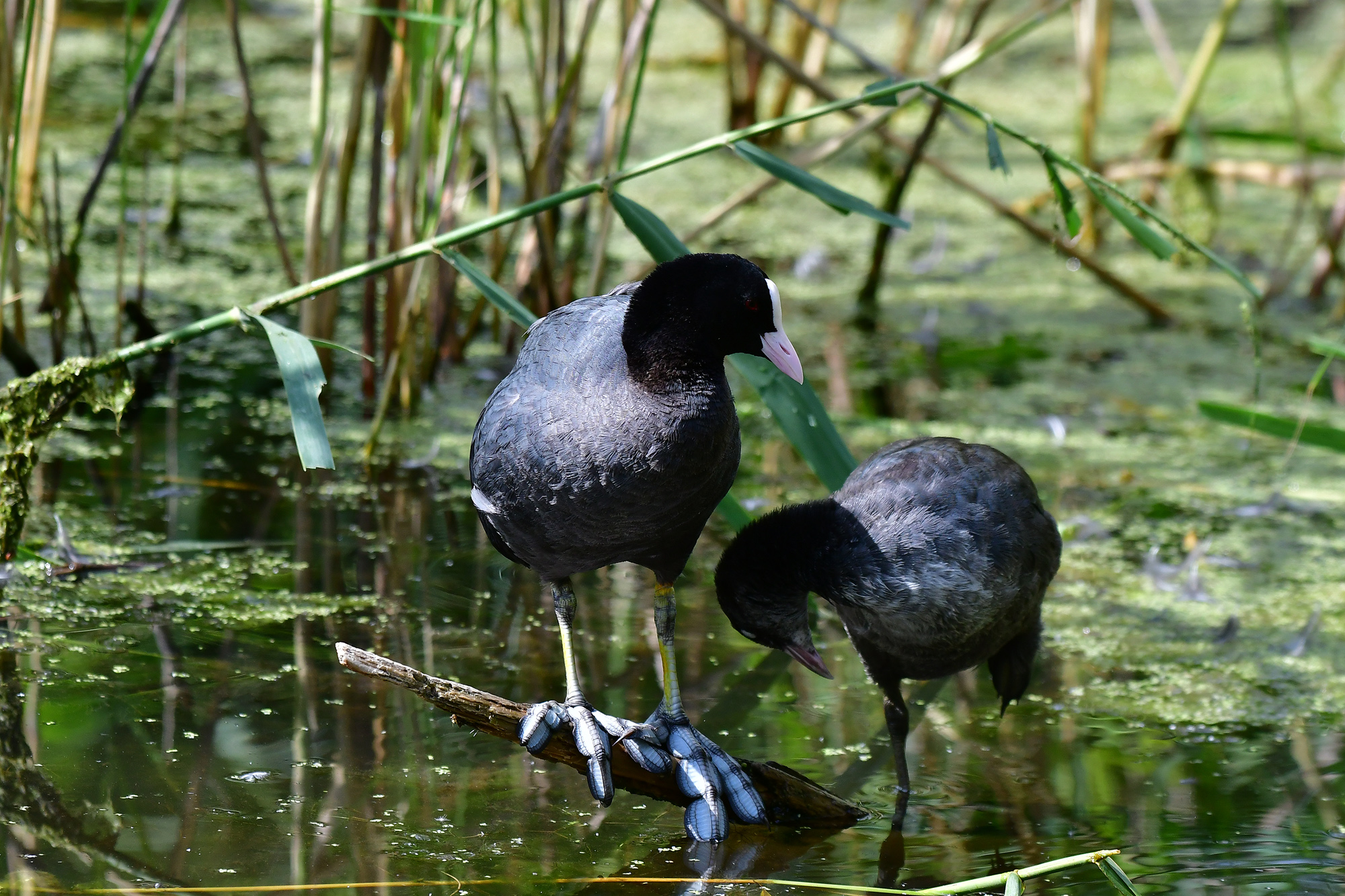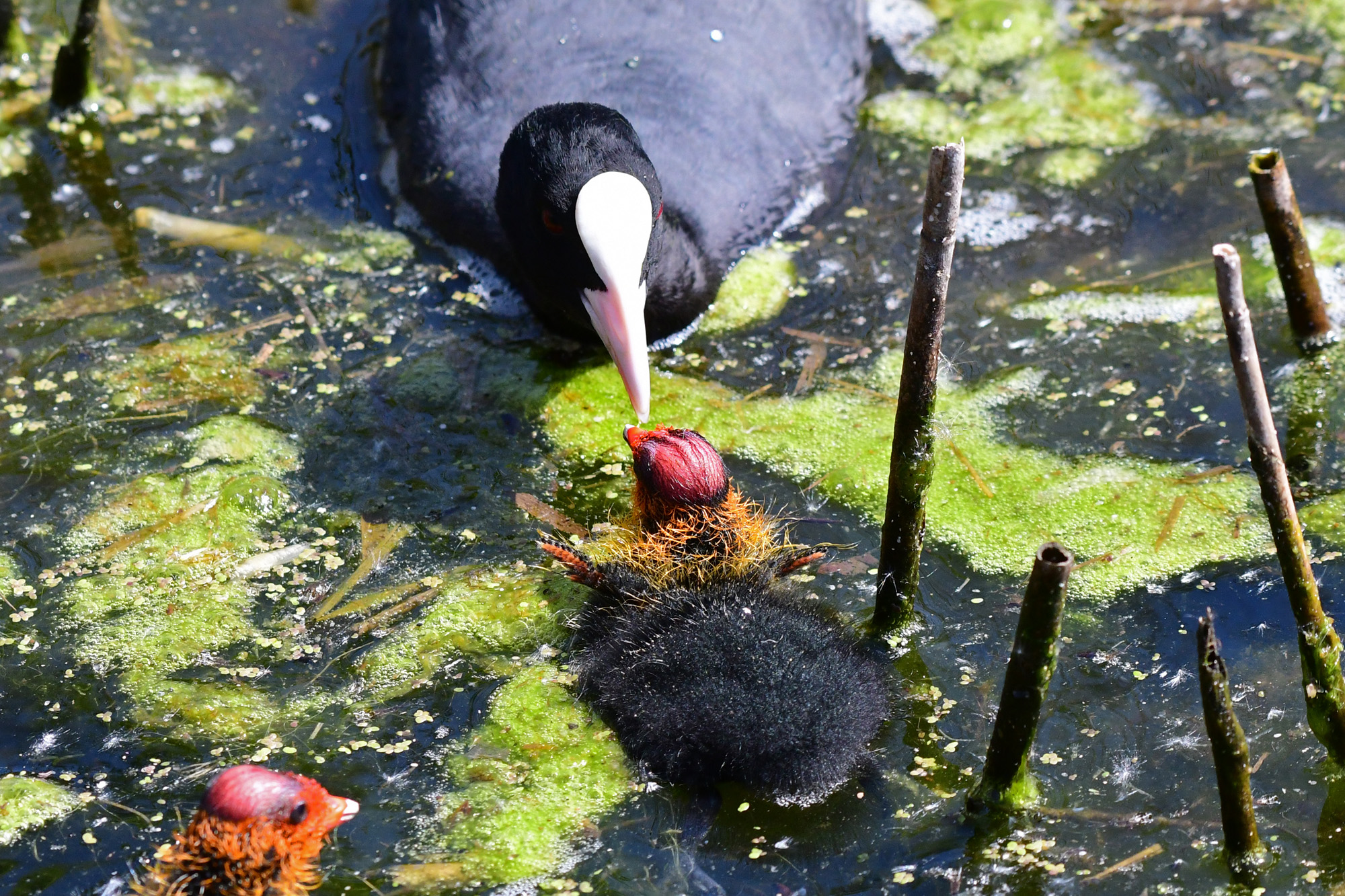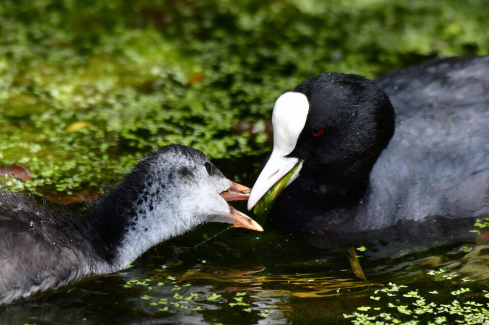 Blässhuhn - Mutter füttert Junges