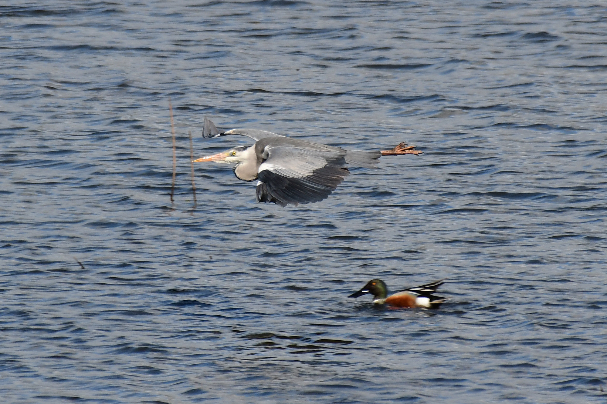 Fischreiher fliegt an Löffelente vorbei