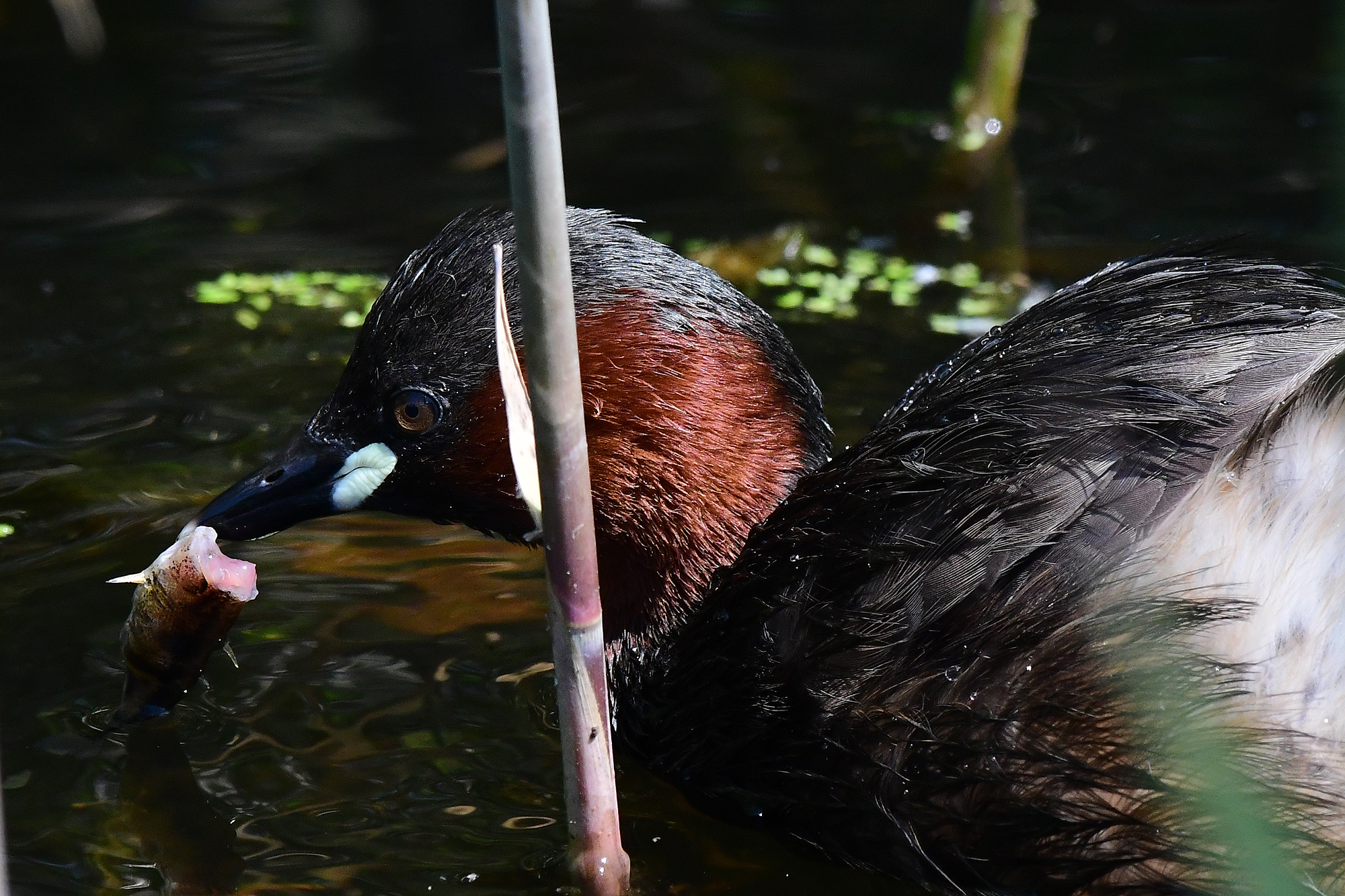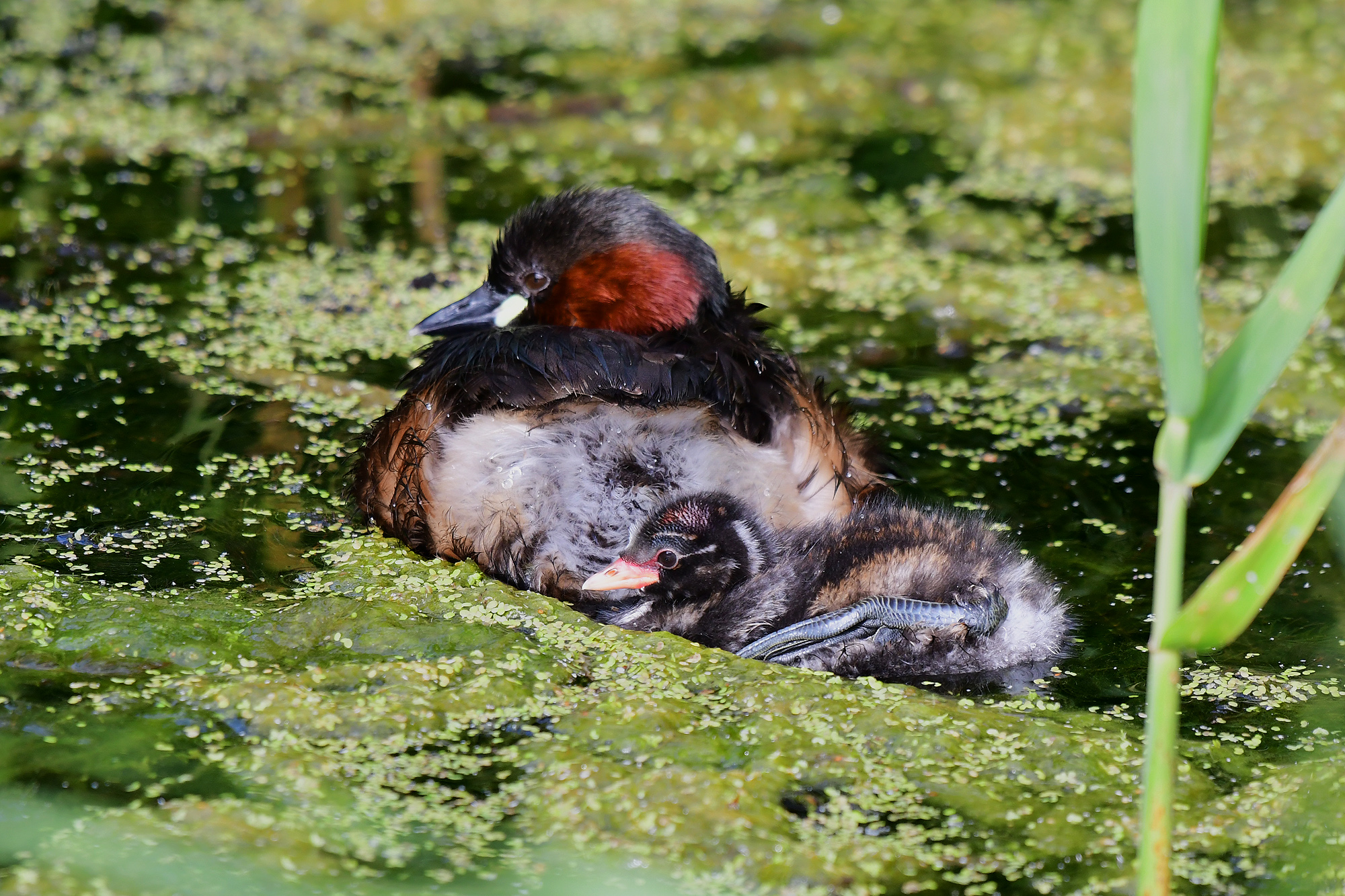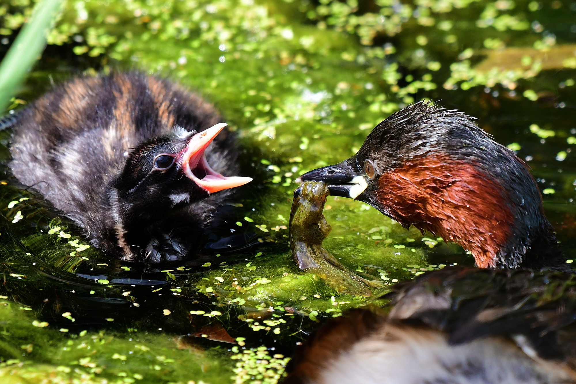 Zwergtaucher verfüttert Froschlarven